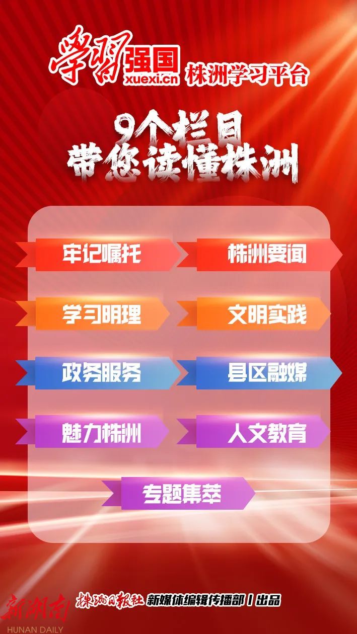 平台设有“牢记嘱托”“株洲要闻”“学习明理”“文明实践”“政务服务”“县区融媒”“魅力株洲”“人文教育”“专题集萃”等9个栏目,集中展示株洲人民“牢记嘱托、感恩奋进”精神风貌,全方位、多角度记录和展示全市加快培育制造名城、建设幸福株洲的生动实践。