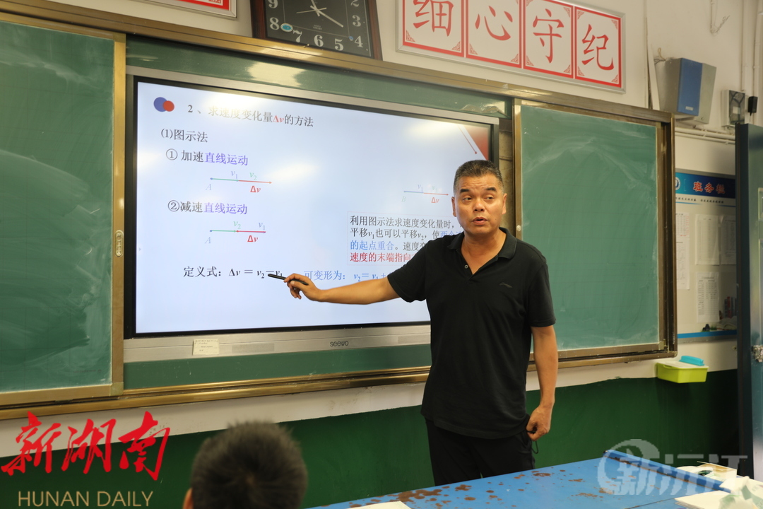在沅江市第一中学2301班,易斌正给学生们讲解物理试题。虽已两鬓略显斑白,讲起课来却声情并茂、引人注目。在他担任班主任的19年里,既有他对教育事业的无限热爱,也有他对学生的无限喜爱,还有学校对他的绝对信任。在他的认知中,每一名学生都是独一无二的,作为一名人民教师要始终把学生摆在第一位,时刻关注他们的学习与生活,引导他们成长成才。易斌说:“作为一名教师最重要的是关心学生、爱护学生,为了学生的一切、一切为了学生。”