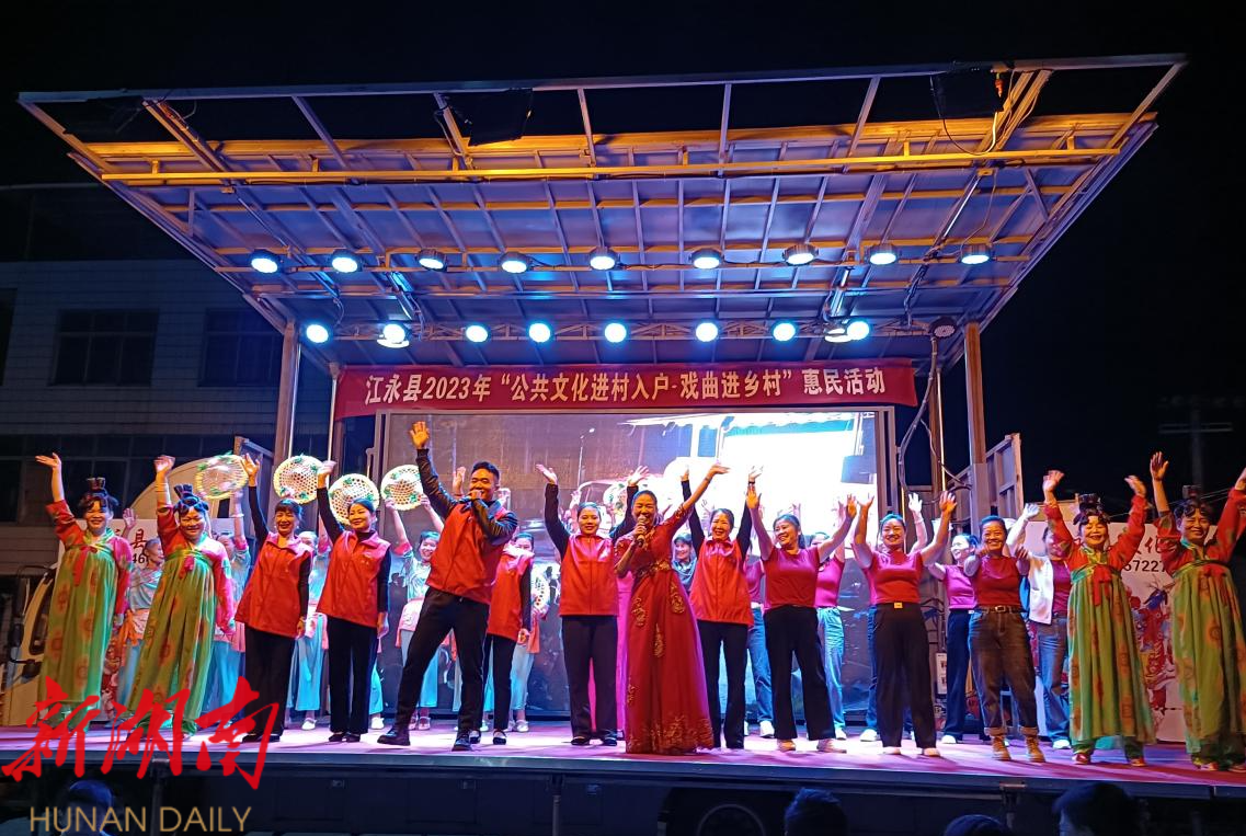 新江永客户端讯(通讯员 董小朋 谢旭)立冬已过,寒意阵阵,但在江永县桃川镇邑口村的村民文化活动中心,却是一片充满暖意、充满激情、充满欢乐的氛围。11月17日晚,江永县文化旅游广电体育局组织的“公共文化进村入户·戏曲进乡村”文艺演出正在这里精彩上演。广大村民白天在田间享受收获香柚、金桔和砂糖桔等各类水果喜悦的同时,晚上又欢聚在一起品尝这场满满的文化下乡演出大餐。