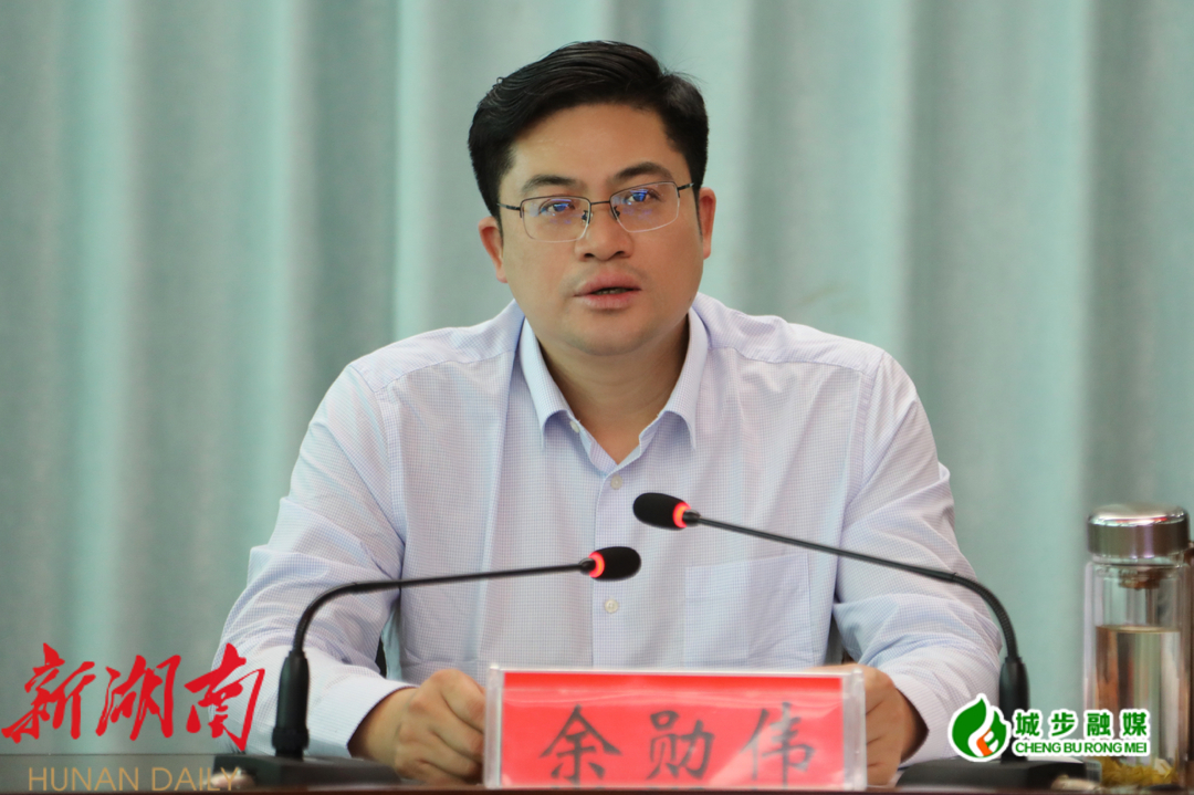 图为县委书记余勋伟在会上讲话