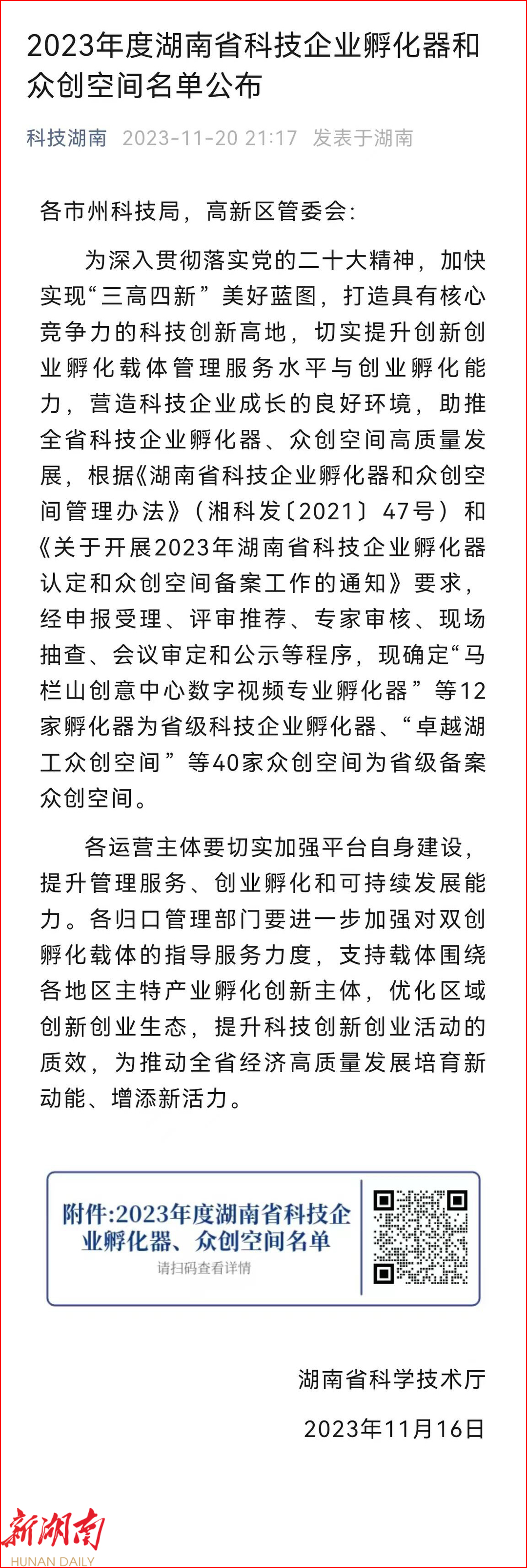 近日,湖南省科学技术厅公布了2023年度湖南省科技企业孵化器和众创空间名单,耒阳经济开发区汇智·众创空间获评省级众创空间。