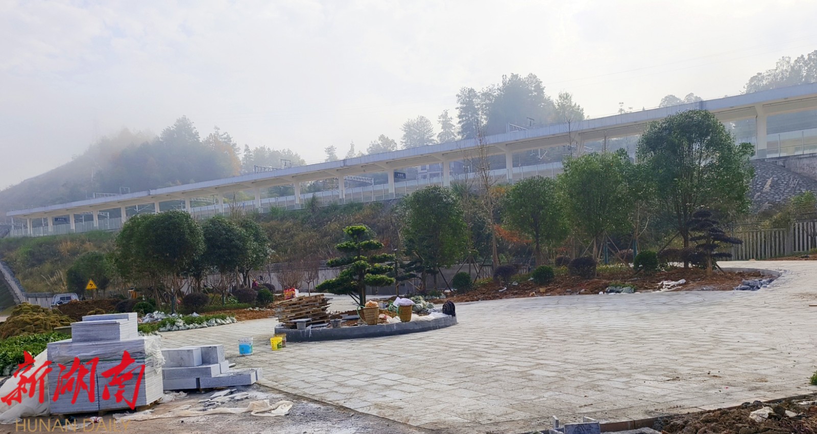 湖南日报·新湖南客户端11月24日讯(通讯员 冯成 李伊平) 11月23日,在桑植县高铁站广场东,工人们正在忙着栽种绿化树木和平整新的公共停车场。一座精致的站前公园和一座大型公交停车场初具雏形。几十米开外的铁轨上,不时可见旁边高铁呼啸而过。