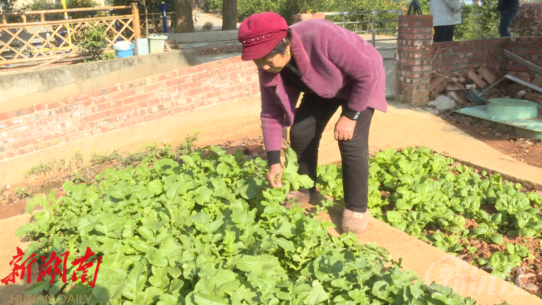 沿着墙绘往里走,村里的老人吴明安正在自家菜园择菜,经过村委的改善,村里的菜园变得干净整洁,田间的水泥路让老人在下雨天也能放心地择菜。对于村里的工作,老人十分支持,屋外也建起了一处“小微景点”,平常的小热闹让老人十分开心。