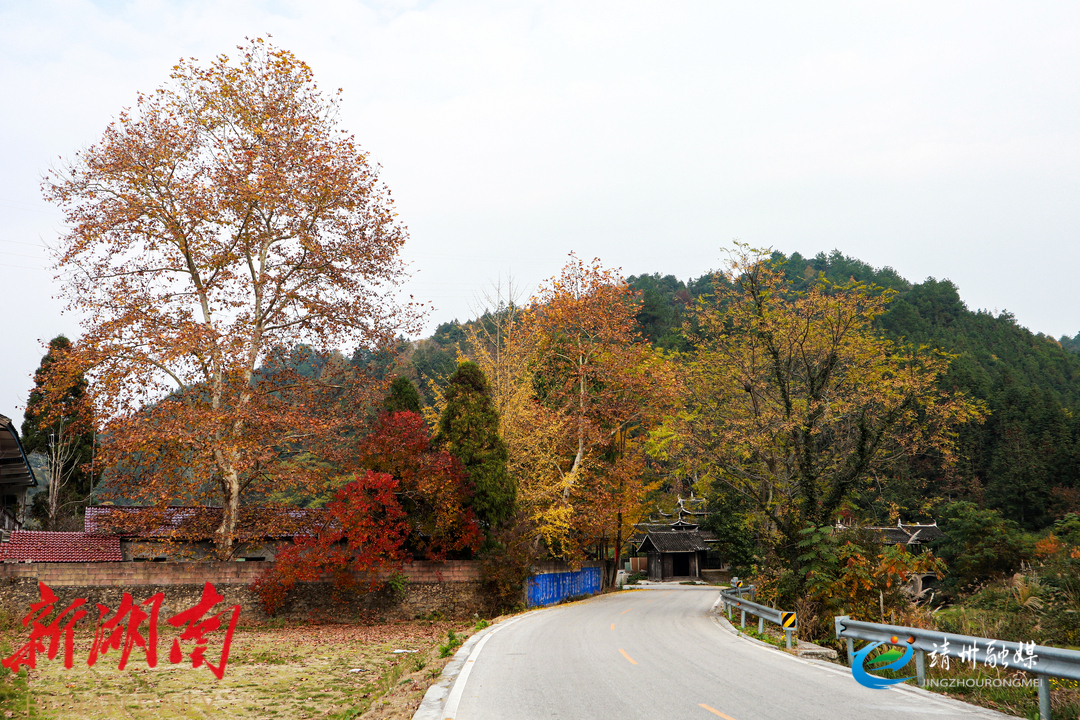 靖州融媒11月27日讯 (通讯员 胡斐 彭英)11月25日,在靖州苗族侗族自治县寨牙乡通往岩脚侗寨的路段上,初冬山谷里像打翻了的颜料盘,红色、橘色、黄色不断蔓延,一缕缕阳光透过树叶,黄得亮眼,红得通透,把村庄装扮得美轮美奂。