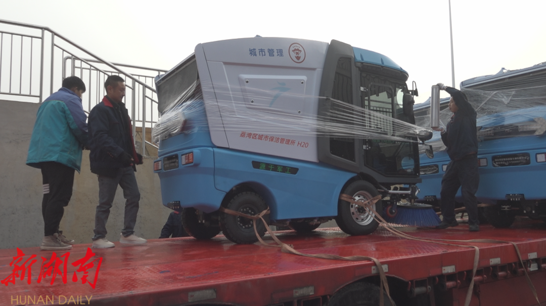 车间外,5辆大卡车已经就位,工人们正忙着通过液压装车平台将这批清扫车运上大卡车,贴上防护膜,并用绑带固定住轮胎。此批发往广州的31台纯电动新能源清扫车,采用纯真空洗扫作业方式,可在夏天、雨雪天等全天候作业,适用于城市主次干道和人行道的机械化清扫保洁,以及大型社区、校园、小区、广场及旅游景区等内部道路场地的清扫。这批新能源环卫车将配合广州环卫部门,持续开展深度化、精细化道路保洁工作,不断推进城市道路机械化清洁“增频提质”。