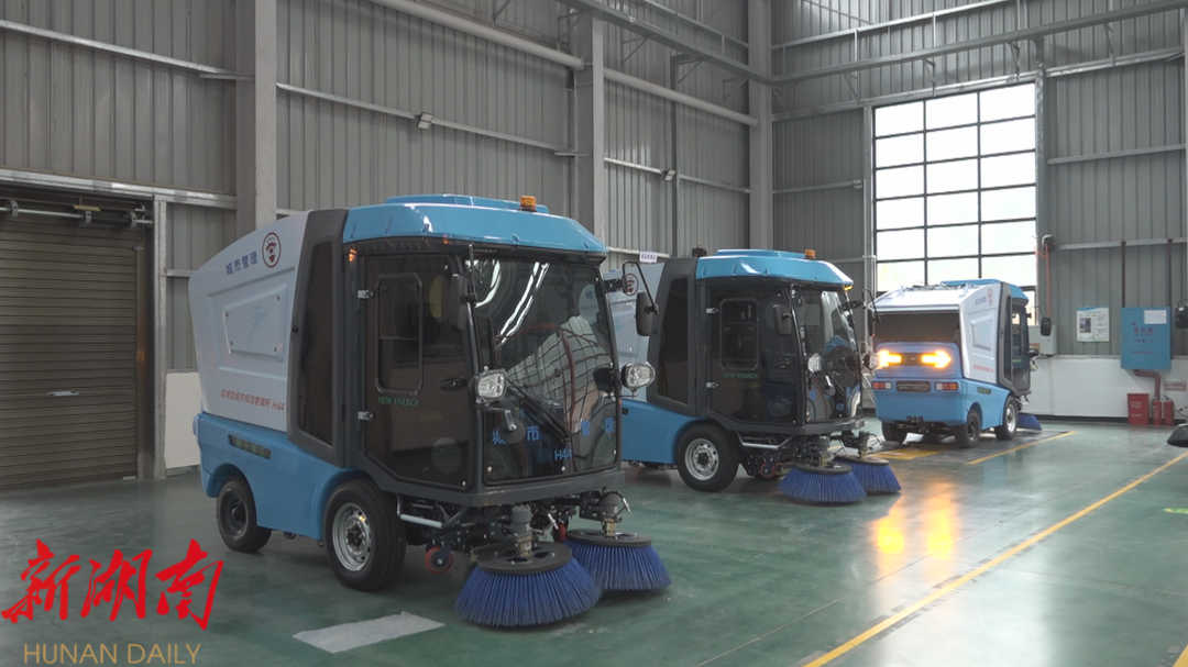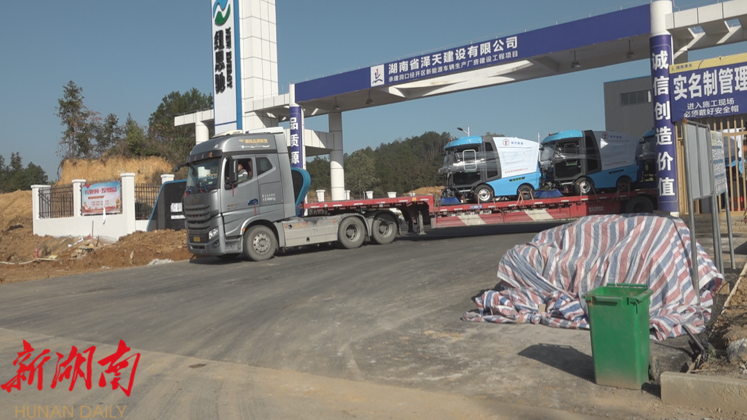 新洞口客户端11月27日讯(记者:刘力渔 ) 11月27日,记者在洞口经开区纽恩驰(湖南)环境产业有限公司车间看到,一辆辆组装完毕的清扫车整齐排列,等候装车。