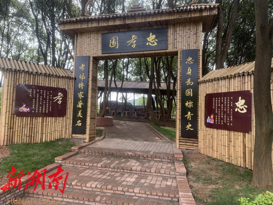 从松柏村党群服务中心沿银都大道往东步行200米,就到了古色古香的忠孝园。竹制大门上方书写了古朴苍劲的三个大字“忠孝园”,大门两边镶嵌一副对联:忠贞报国标青史,孝悌传家著美名。园内建有忠孝文化墙,文化墙两面分别展示了古代二十四孝的故事、劳动工具以及神农炎帝、大禹、后稷和袁隆平的事迹。文化墙对面是休闲长廊,设有6套木制桌椅,供村民下象棋、打扑克娱乐。山顶建有忠孝书吧,定期开展忠孝文化交流,弘扬践行新时代忠孝文化。“忠孝园一期工程已经完工,二期工程计划建设就业广场、插标分田纪念坊、孝子塑像和1000米游道。”松柏村党总支书记 、村委会主任李雄雄介绍说。