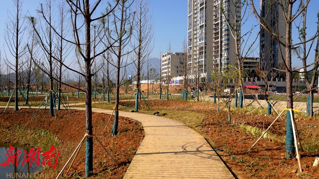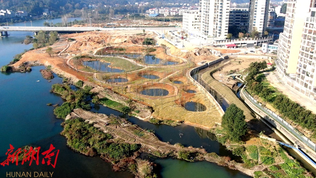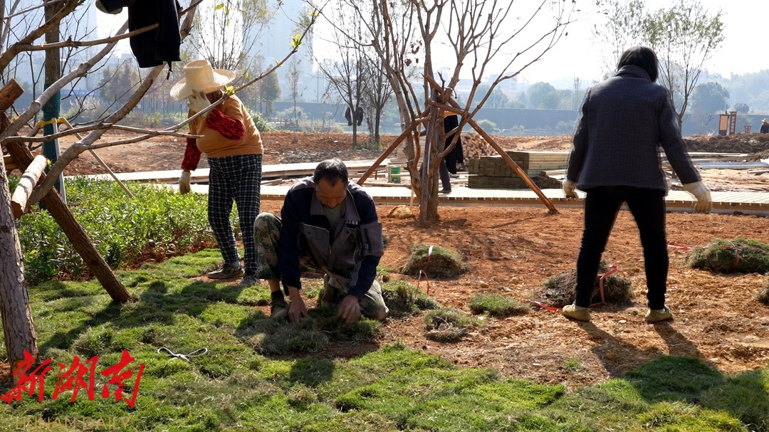 初冬的平溪江洞口三桥河段沿岸美景如画。11月28日上午,在洞口三桥净化示范园项目施工现场,工人们正忙着栽种植被、铺设草皮,昔日乱堆乱放杂草丛生的荒地,蝶变为滨江公园。