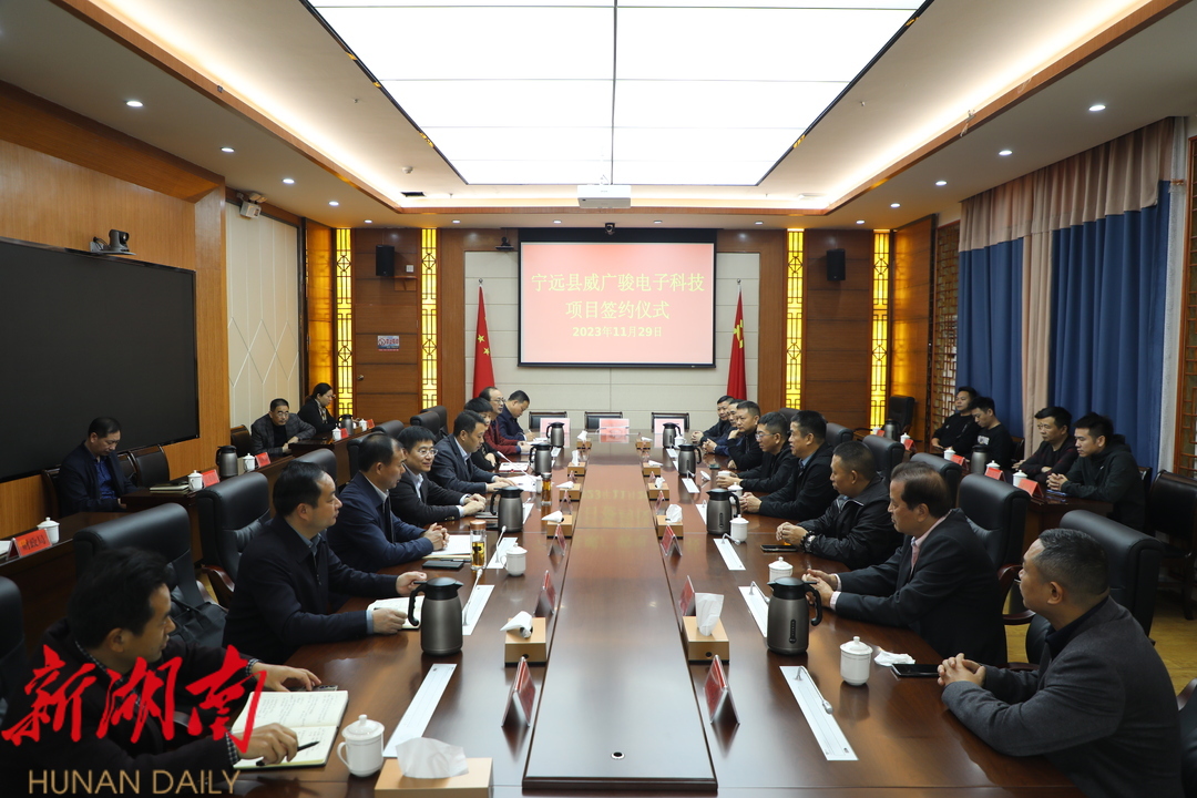 湖南日报 新湖南客户端11月29日讯(通讯员 何勇辉 李芳 )11月29日上午,宁远县与东莞市威广骏电子科技有限公司举行了签约仪式。县委书记胡勇刚,东莞市威广骏电子科技有限公司总经理陈拥宾出席并讲话,县委常委、常务副县长齐纲要主持签约仪式。杨国基、肖红梅等县领导及相关部门与企业见证了签约。