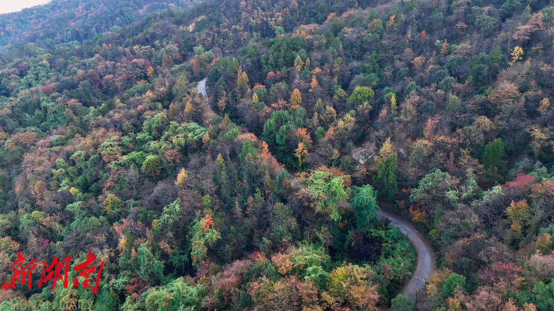 在金兰镇寺冲峡谷,一树树红枫装点着千山万壑,映红了碧水蓝天,像极了一幅色彩斑斓的油画。漫步于山谷之中,绵延数公里的红枫树经过低温霜打之后,叶色逐渐由青变黄、转橙、呈红、泛紫。各色枫叶交织在一起,层林尽染,犹如彩蝶群舞,梦幻斑斓。从高空俯瞰枫林,一株株红枫树构成山峦间起伏的圆形红点,为大地赋予了生机活力,与隐藏山林之中的古寺,山麓之下村落,构成一幅美丽的冬日“枫”景画卷。