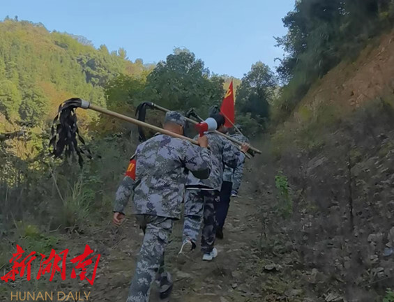 湖南日报·新湖南客户端11月30日讯(通讯员 胡和虎)“不要烧茅草,不要烧土灰,严禁一切野外用火……”11月29日,冬日暖阳下,一群穿着迷彩服、戴着红袖章、扛着拖把、提着小喇叭的党员队伍,穿梭于永兴县马田镇金华村的村前村后和林间山道,森林防火宣传声响彻在林间山中。