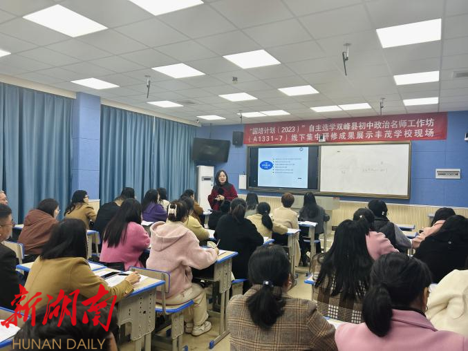 湖南日报·新湖南客户端11月30日讯( 通讯员 谢研专 贺华荣 ) 为促进教师专业发展,凝练并提升研修成果,11月29日,“国培计划(2023)”自主选学双峰县初中政治名师工作坊(A1331-7)线下研修成果展示活动在丰茂学校举行。工作坊50名学员、坊主持人团队以及丰茂学校部分老师参加此次活动。