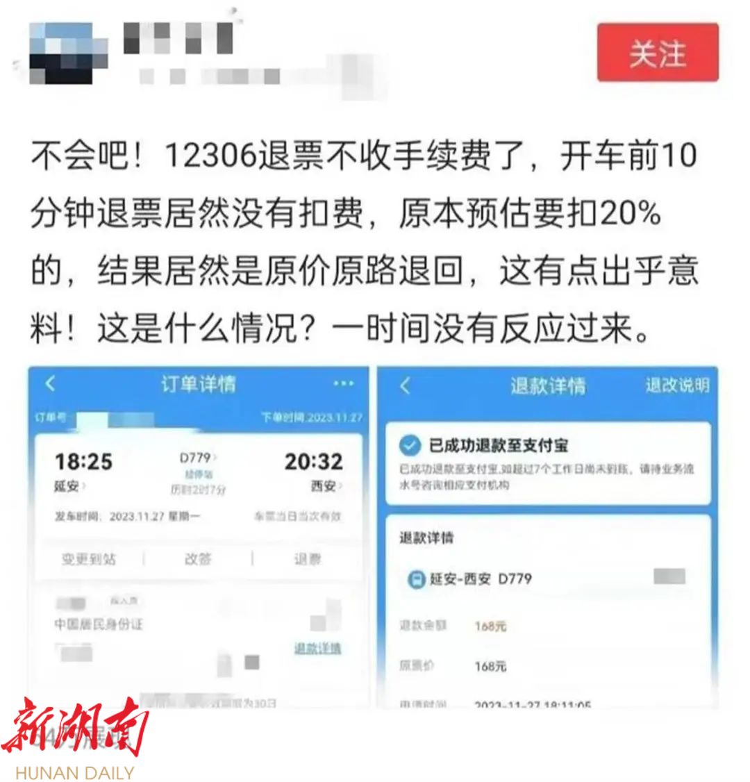 据人民网11月30日报道,近日,一则“12306退票不收手续费了,开车前10分钟退票居然没有扣费”的信息引起网友关注。对此,铁路部门进行回应。