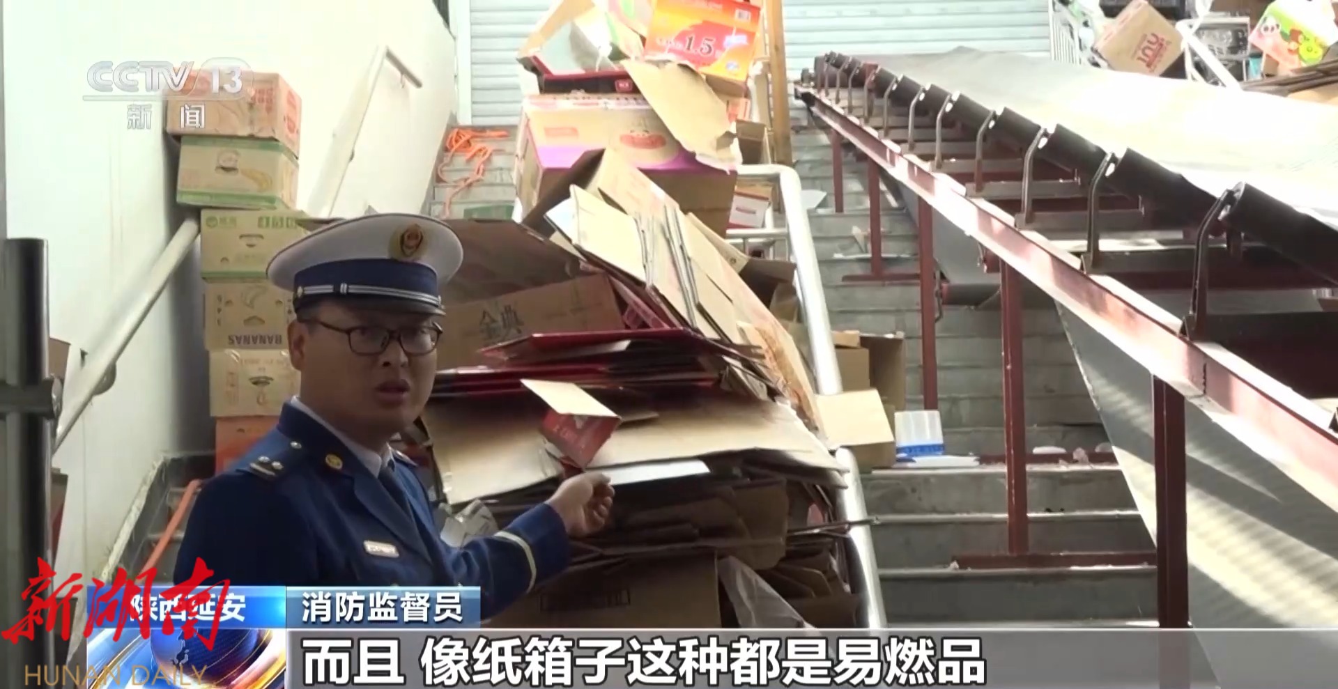消防监督员: 两边堆积的东西太多,而且像纸箱子这种都是易燃品,把这些东西全清理了。
