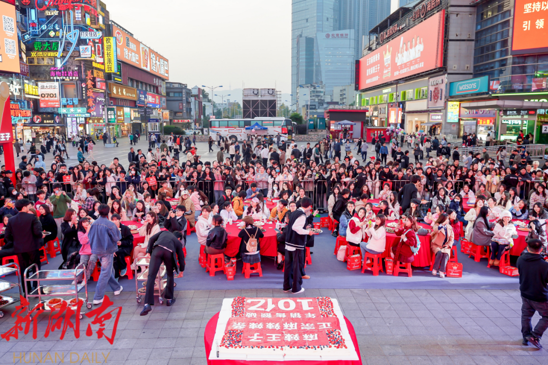 为了回馈消费者多年来的支持,麻辣王子还特别在长沙黄兴广场准备了辣条宴,以及长达1.5米的超级辣条蛋糕,邀请100位粉丝共同品尝。“辣条蛋糕”“辣条小龙虾”“辣条披萨”等10种由辣条制作而成的辣条宴席,让辣条爱好者们大饱口福。
