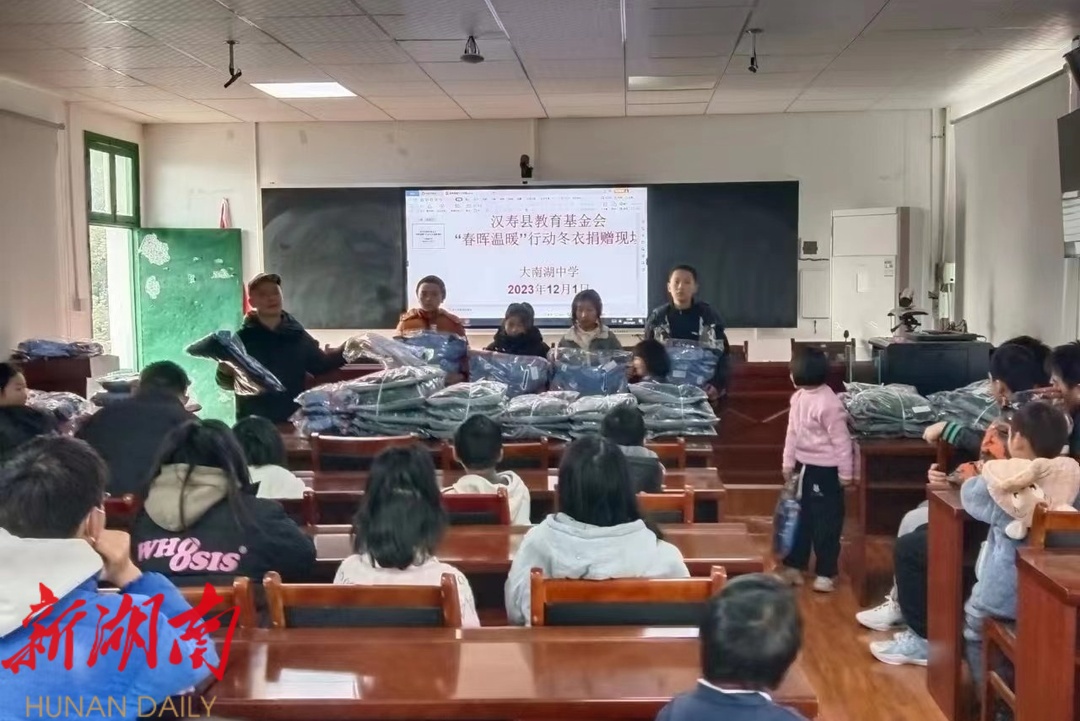 12月1日,汉寿县大南湖中学的74名学生收到了汉寿县教育基金会“春晖温暖”行动捐赠的冬衣。