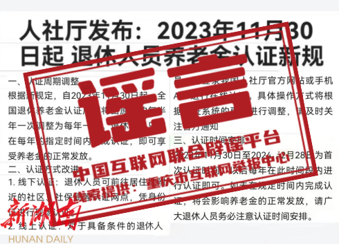 真相: 近日,一张“人社厅发布:2023年11月30日起退休人员养老金认证新规”的截图在网上流传,引发关注。截图显示,“根据新规定,自2023年11月30日起,全国退休养老金认证周期将由原来的每半年一次调整为每年一次”“2023年11月30日至2024年2月28日为首次认证时间……如未在规定时间内完成认证,将会影响养老金的正常发放……”。对此,重庆市人社局回应称,按照国家规定,按月领取基本养老金的人员,在一个认证服务期内(365天)至少需要进行一次养老待遇资格认证,也可以多次认证,认证后认证期自动向后递延。也就是说,在认证服务期内随时都可认证,没有固定必须在某一时间段认证,只要两次认证的时间间隔不超过一年即可。网传截图中的表述均为不实信息。(来源:重庆社保、“重庆辟谣”微信公众号)