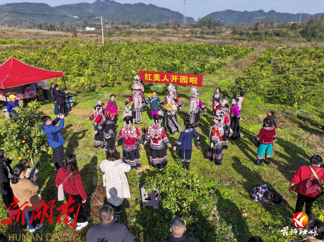基地里,清新的橘香扑鼻而来,果园里枝头成片缀满了金灿灿沉甸甸的“红美人”。勤劳质朴的苗家人身着苗族节日盛装载歌载舞,踏着冬日的节拍,分享丰收的喜悦。随后,大家手拿剪刀,提着篮子,亲手摘下“红美人”,甜入心间。