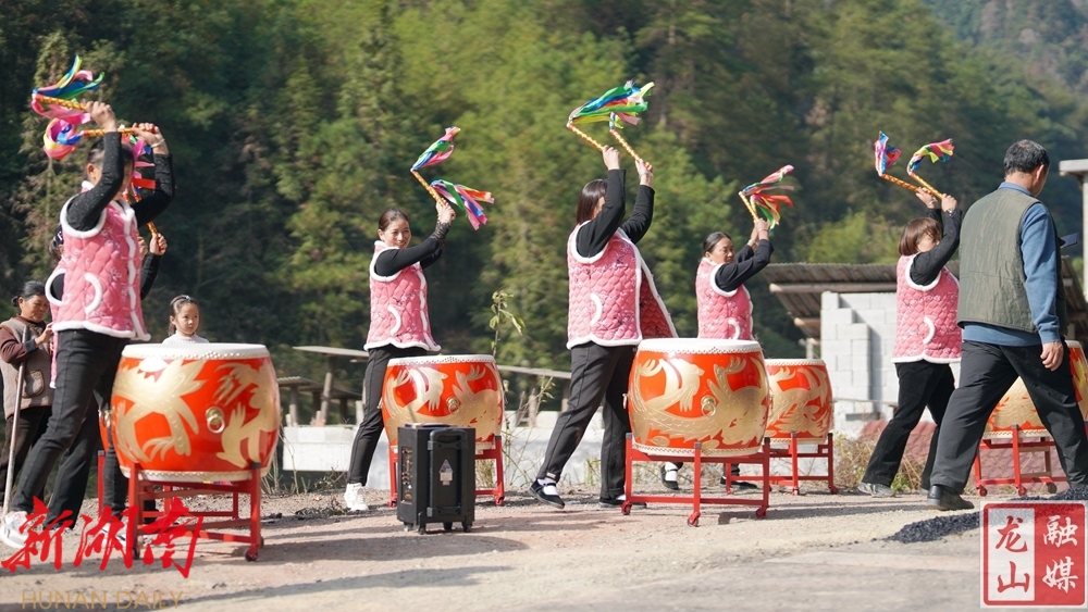 在沙湖村铺沥青现场,为感谢州交通运输局的帮扶,村民自发组织大鼓队现场表演,以表村民的内心喜悦和感谢。