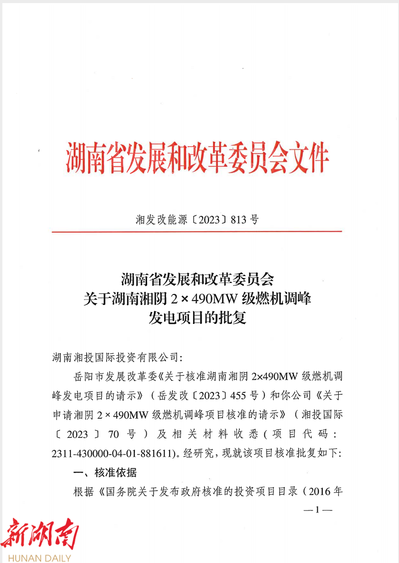 湖南日报·新湖南客户端12月7日讯(通讯员 刘慧 黄超国 刘美霞)近日,湘阴2×490MW级燃机调峰发电项目获得湖南省发改委项目核准批复,标志着湘阴燃机调峰发电项目取得突破性进展。