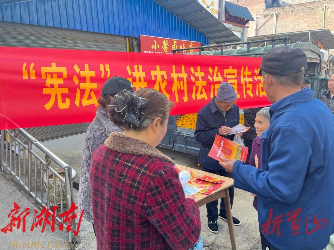 ▲为推动深入学习宪法,弘扬宪法精神,使尊法学法守法用法在农村蔚然成风,12月6日,大桥瑶族乡平安建设办和新时代文明实践所工作人员在大桥集市开展“宪法进农村”普法宣传活动。(通讯员 肖洪玫)