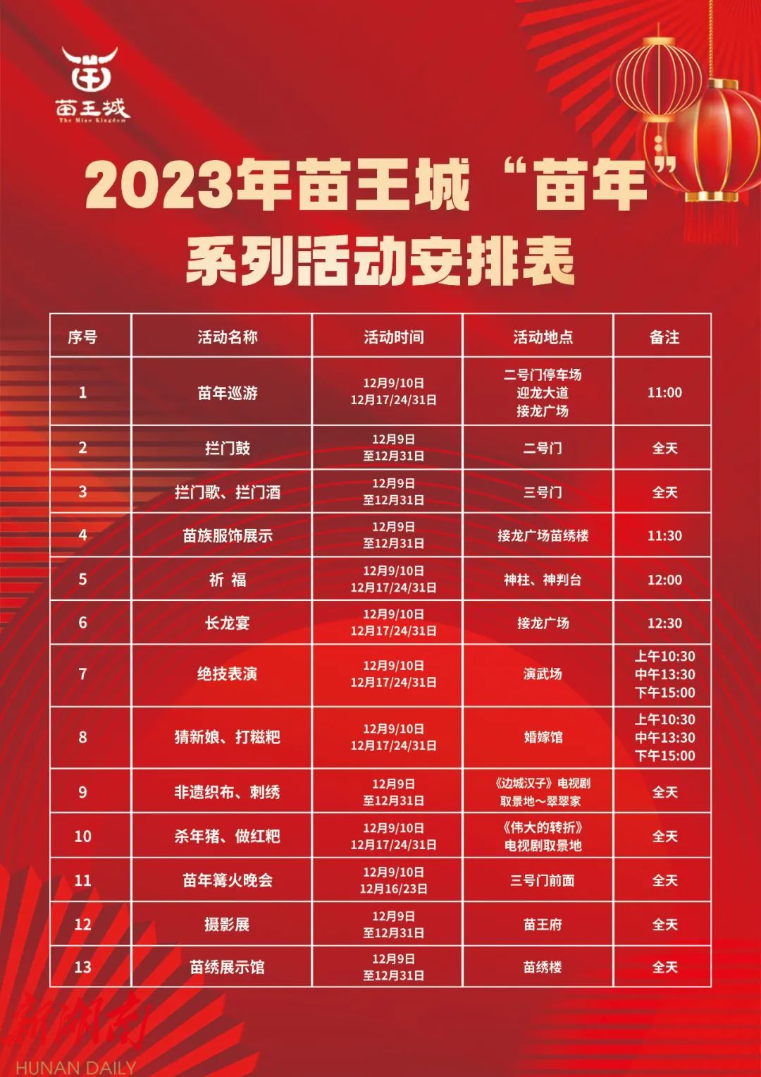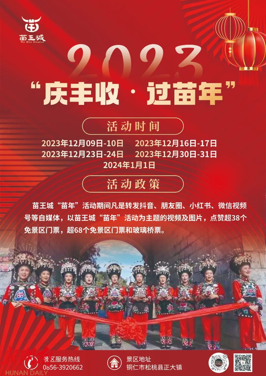 为弘扬和传承苗族非物质文化遗产、彰显苗族传统文化魅力、增强民族文化聚合力,松桃自治县苗王城景区拟于2023年12月9、10、16、17、23、24、30、31日——2024年1月1日诚邀八方宾客到苗乡做客。