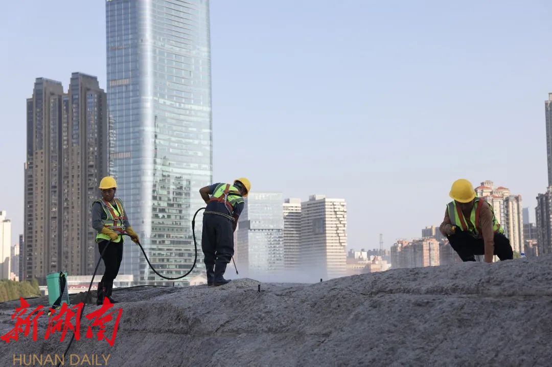 第一阶段自10月8日开始,清洗雕塑的表面。11月初开启第二阶段,由人工用刀片铲除石材接缝原密封胶,再用手磨机打磨处理8700多块永定红花岗岩石,最后采用中性硅酮耐候胶重新密封。第三阶段则是使用定制石材专用保护剂对整个雕塑的表面进行涂抹,起到防尘、防污等作用。