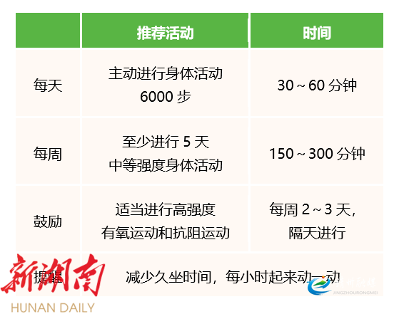 活动可以随时随地进行。将运动列入每天的时间表,培养运动意识和习惯,有计划安排运动,循序渐进,逐渐增加运动量,达到每周建议量。
