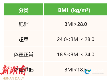 体重变化是判断一段时期内能量平衡与否最简便易行的指标,也是判断吃动是否平衡的指标。目前常用的判断健康体重的指标是体质指数(body mass index,BMI),它的计算方法是用体重(kg)除以身高(m)的平方。我国健康成年人(18~64 岁)的 BMI 应在 18.5~23.9 kg/m2(表1),65岁以上老年人的适宜体重和BMI应该略高(20~26.9kg/m2)。