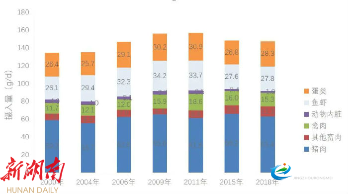 从1982年至今的营养调查资料显示,我国居民肉类食品摄入量逐年增高。与2010—2012年监测结果比较,近5~8年间变化不大。另一项来自中国健康与营养调查(CHNS)同样显示,从2000年到2018年,我国成人居民畜、禽、鱼、蛋类食物摄入量保持相对稳定水平(图1)。
