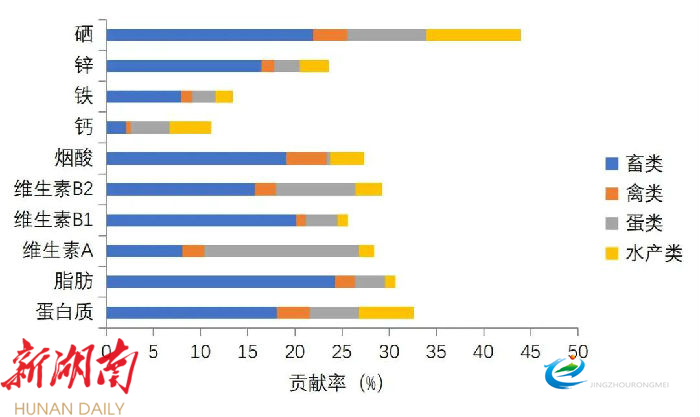 畜禽类、蛋类和水产品是膳食蛋白质、脂肪、维生素A、B族维生素和矿物质的良好来源。鱼、禽、蛋类和畜肉在膳食满足人体对营养素的需要中占有重要地位。按照2015—2017年中国营养与健康状况监测数据,计算畜、禽、鱼、蛋类食物所提供的主要营养素对膳食营养素的贡献率,结果见图2。