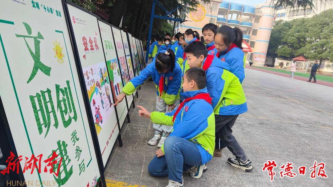 学生驻足欣赏文明“十小事”展板走进该校教学楼,记者发现走廊、厕所以及楼梯口都张贴了文明“十小事”的温馨提示牌。课间学生追赶打闹的少了,厕所干净整洁。该校党支部书记、校长徐绍妮介绍,文明“十小事”是她今年8月份来武陵区胜利路小学后和行政班子成员一起作出的设计构想,于11月初与全校师生正式“见面”。文明“十小事”的内容有环保礼、如厕礼、问候礼、安全礼、排队礼、课间礼、洗手礼、出行礼、上课礼、德美礼。徐绍妮坦言,文明礼仪需要从小培养,行为习惯需要从小事做起,家校合作方能显成效,起初还担心家长不配合,没想到家长们来校学习文明“十小事”内容后,非常支持这项工作,还给学校提出了进一步完善的合理化建议。徐绍妮告诉记者,自10月份文明“十小事”主题画作和童谣征集令发出后,各班积极响应,收到了63幅作品,经美术老师指导后,25幅作品入围,最终,全校师生参与投票选出了10幅作品。