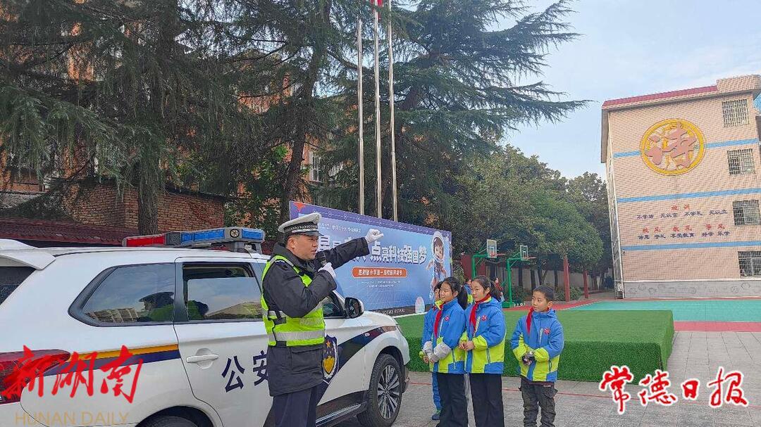 12月4日是周一,武陵区胜利路小学的升旗仪式主题活动时间,与以往不同的是,市交警支队直属二大队的民警将警车开进校园,给全校师生示范讲解交通出行之安全礼,这是该校文明“十小事”发布后举行的首个大型主题活动。