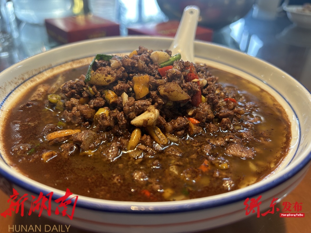 “炒碎血鸭”多年来一直是大龙饭铺招牌菜,采用新鲜鸭肉剁碎,热锅里倒入茶油,烧至七成热,放入剁碎的鸭子煸干水分, 随后淋上新鲜的鸭血,关小火、撒葱花、淋上茶油、放入黄贡椒等配料炒匀即可出锅。鸭肉入口鲜嫩下饭且十分开胃,成为必点菜之一,也让前来光顾的新老顾客赞不绝口。