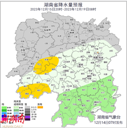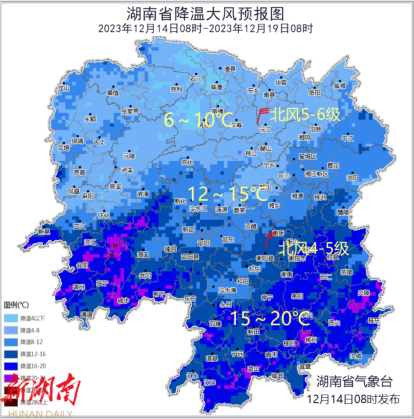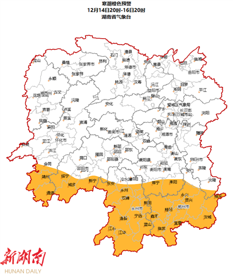 湖南省气象台12月14日16时发布寒潮橙色预警: 预计14日20时至16日20时,衡阳南部、邵阳西南部、郴州、 永州、怀化西南部最低气温将下降12℃以上,最低气温≤4℃,并可能伴有5级以上偏北大风,请注意防范。