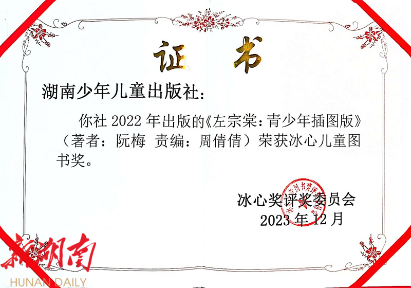 湖南日报·新湖南客户端12月22日讯(通讯员 黎倬 徐晚晴)12月21日,2023年冰心儿童图书奖评奖结果揭晓,湘籍儿童文学作家阮梅全新原创纪实文学作品《左宗棠》(青少年插图版)榜上有名。这是该作品继上月获评湖南省优秀社会科学普及作品后斩获的又一奖项。