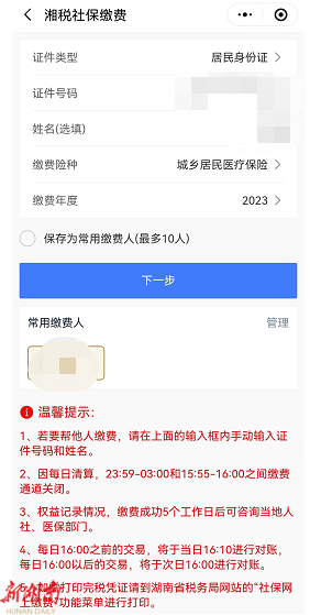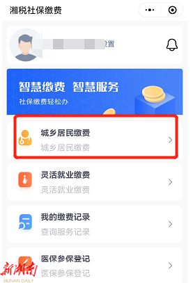 第一步:扫描上方二维码,进入湘税社保小程序,点击【城乡居民缴费】