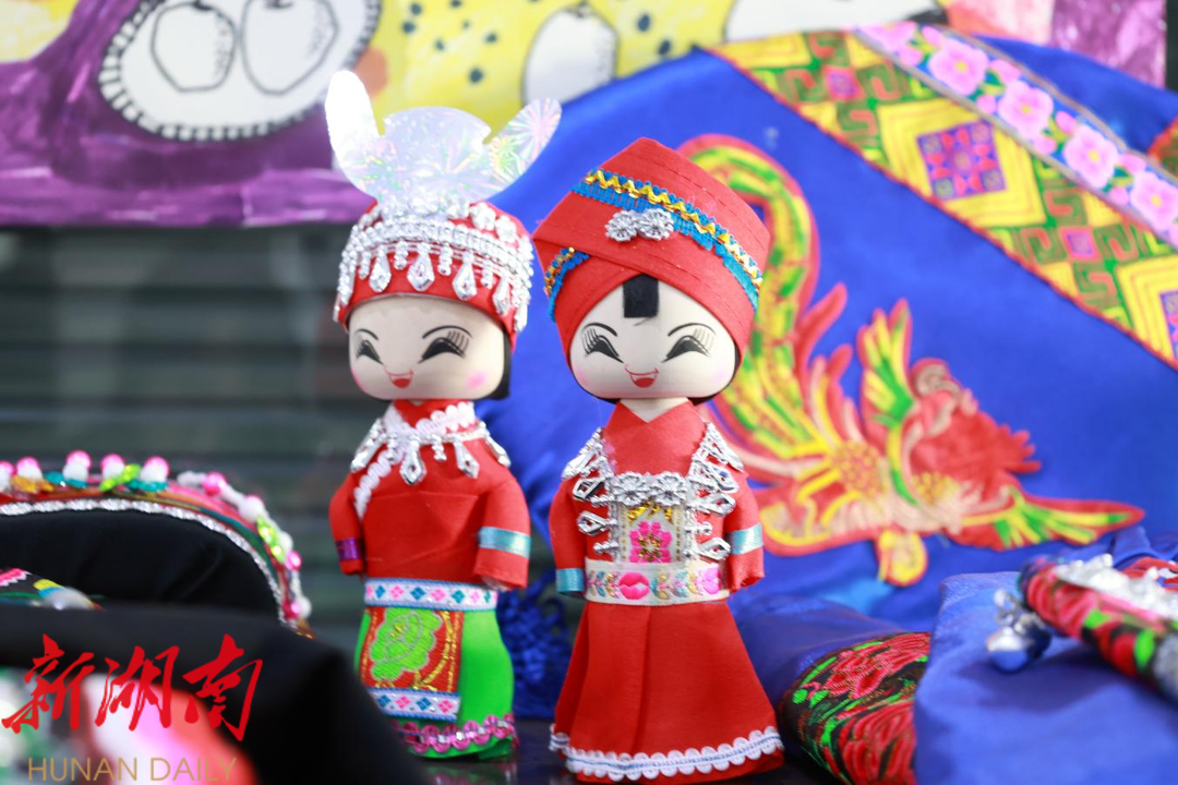 图为湘贸社区文化墙摆放的民族团结手工作品。文雅丽摄