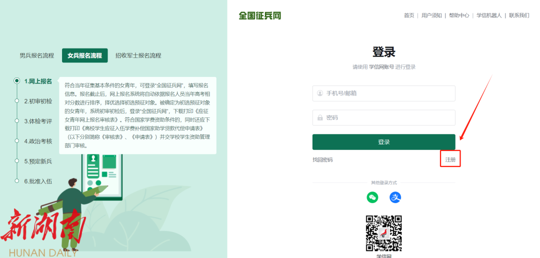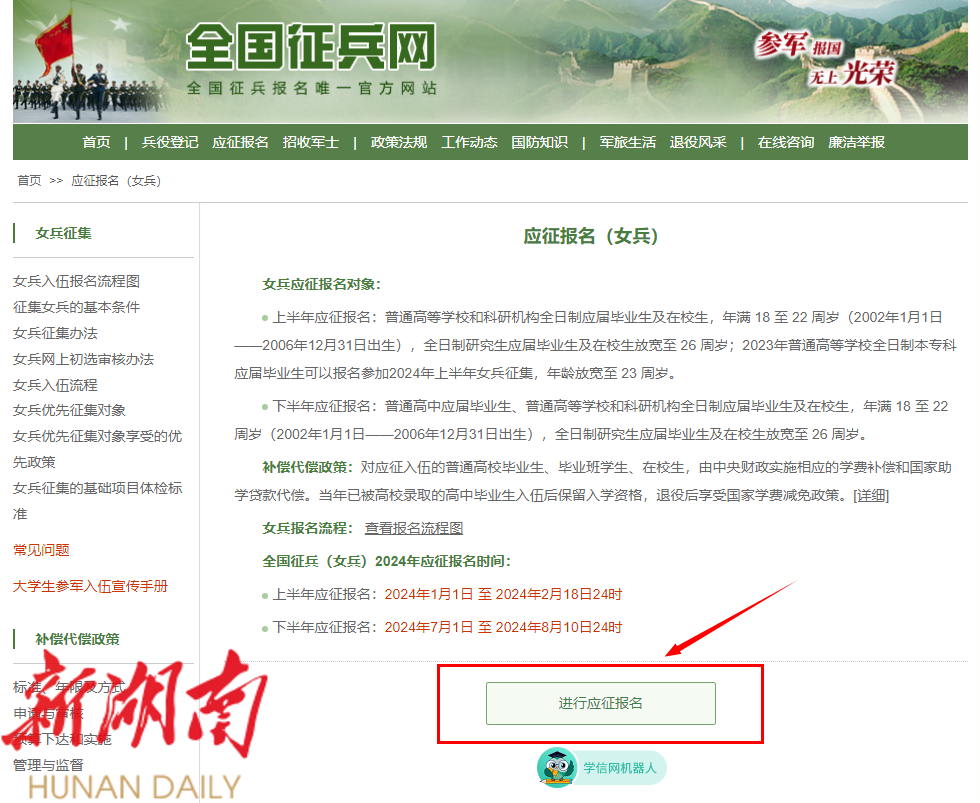 1、登录全国征兵网 https://www.gfbzb.gov.cn/(文末“阅读原文”可跳转)首页右侧,点击“应征报名(女兵)”。 2、进入这个界面之后,点击“进行应征报名”跳转。 3、如果此时还没有登录账号,会出现以下界面,用学信网账号进行登录就可以了。但如果没有学信网账号,请点击“注册”按钮,进行注册,注册完之后就可以登录了。 注意:注册学信网账号必须实名,一定要用真实姓名和身份证认真填写,兵役机关将对有效信息进行审核。