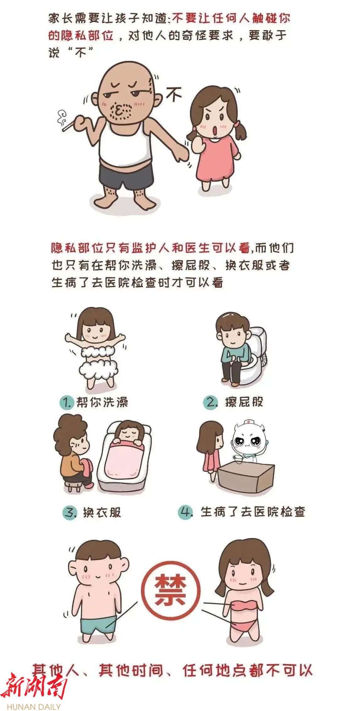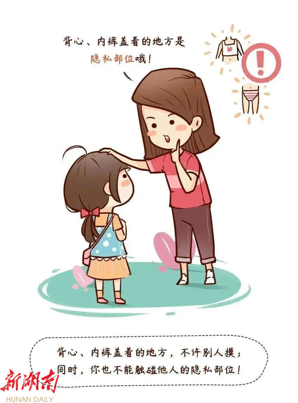 明确告诉孩子: 背心和小裤衩遮住的地方都是隐私部位,隐私部位是属于我们身体的小秘密,不许他人触碰、看。如果有人想要触碰你的隐私部位,一定要勇敢地对他说:“ 不要随便碰我! ”