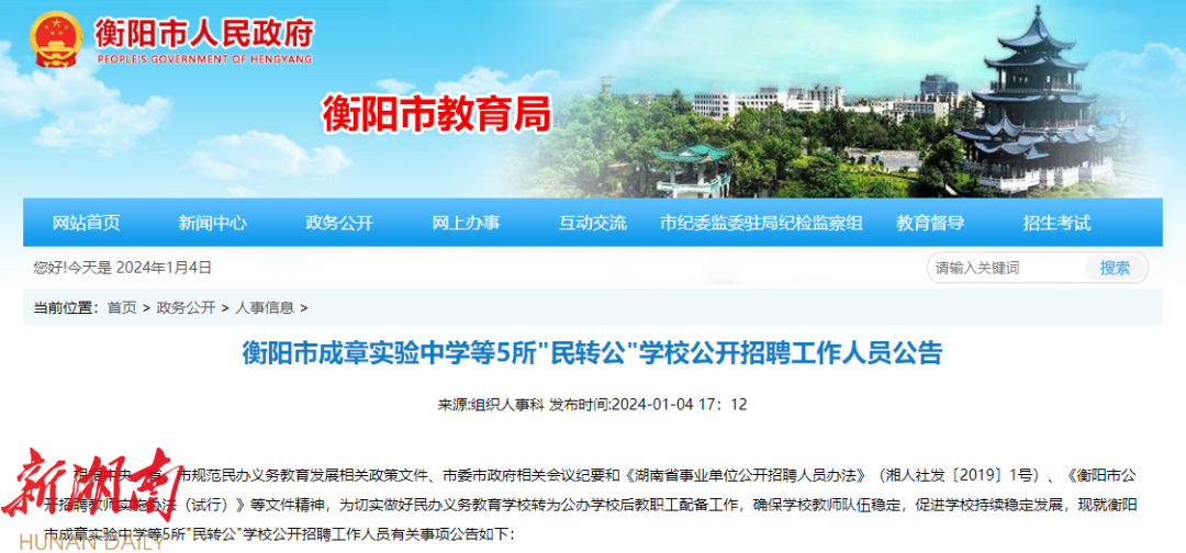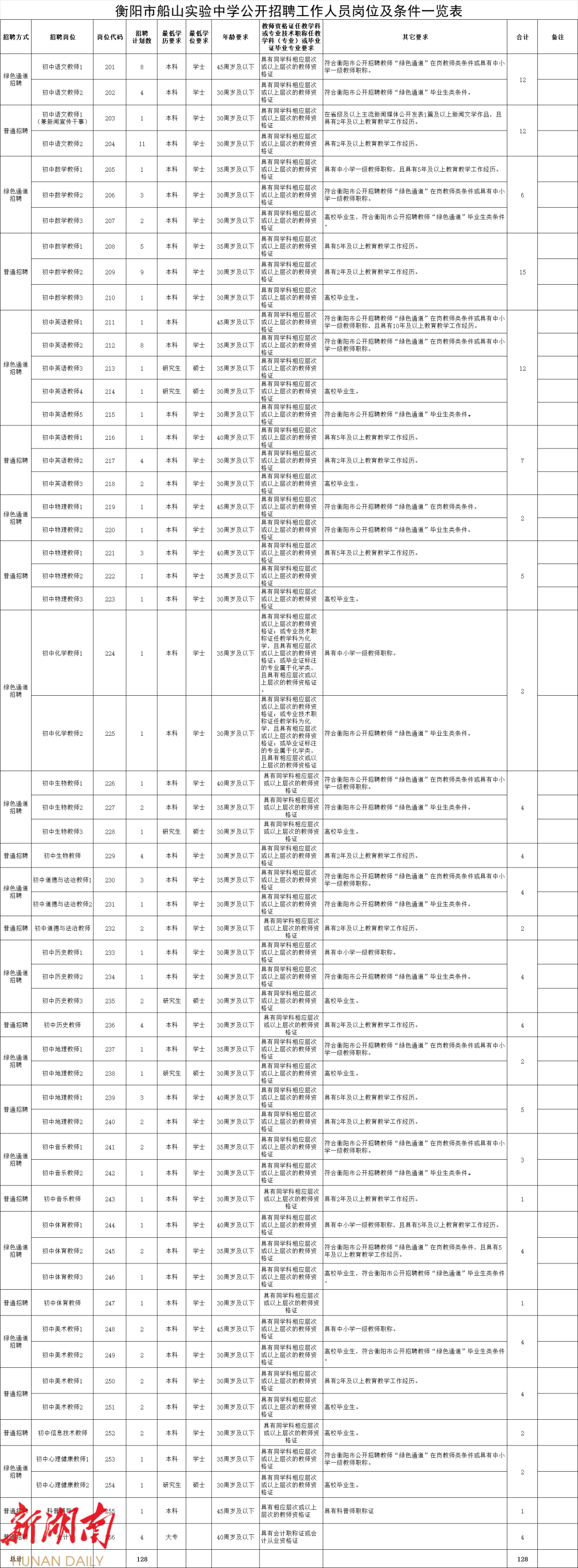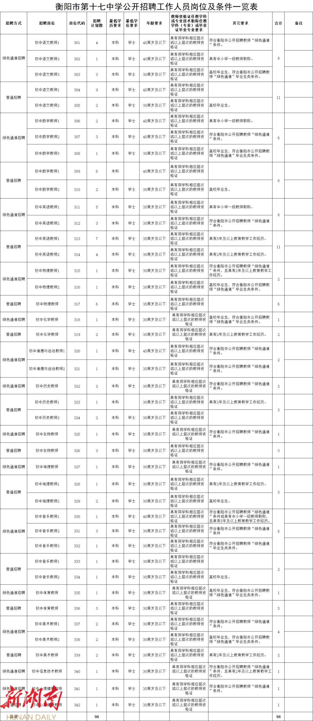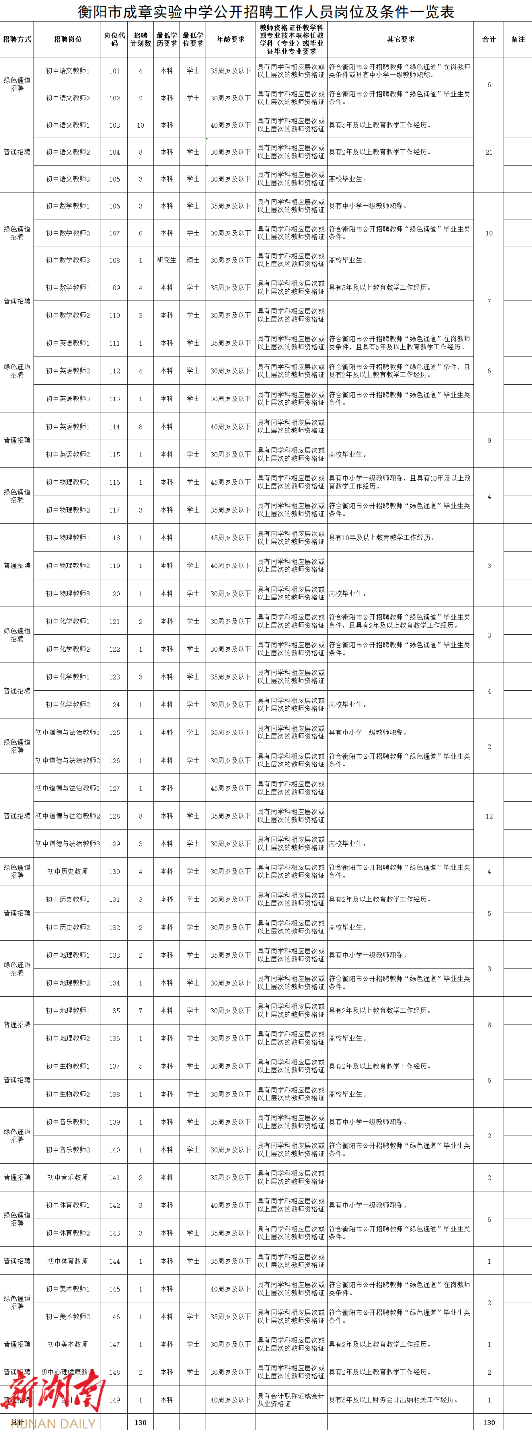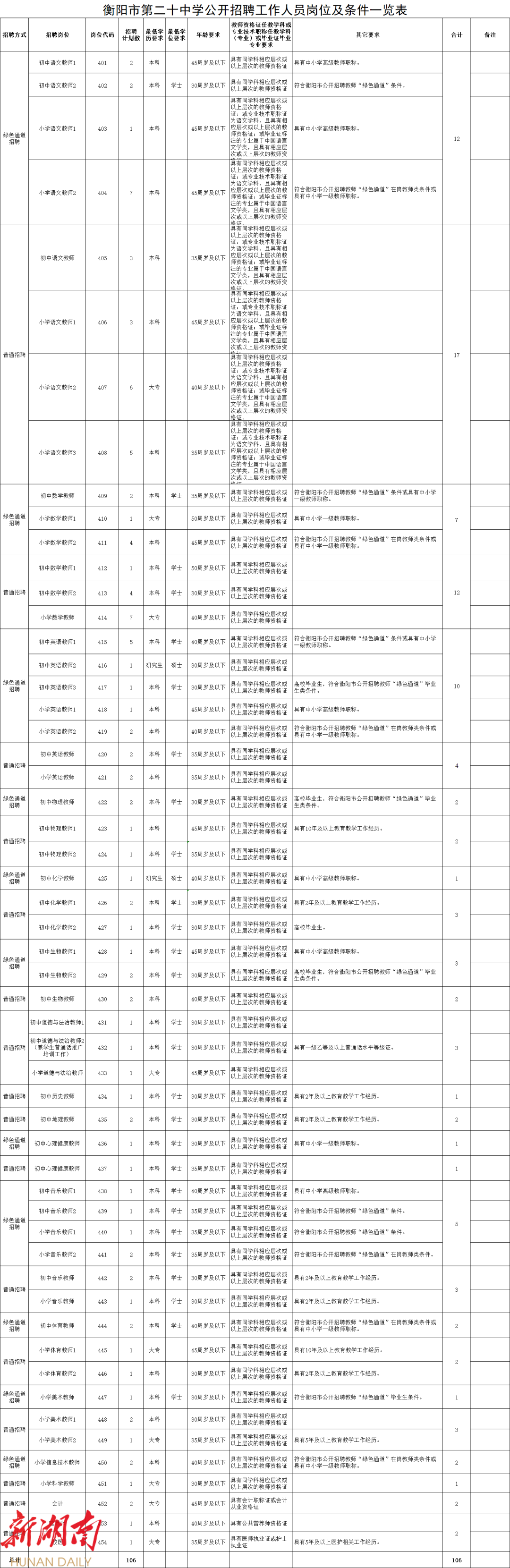 1.具有中华人民共和国国籍; 2.遵守中华人民共和国宪法和法律; 3.具有良好的品行和职业道德; 4.具备岗位所需的专业或技能条件; 5.适应岗位要求的身体条件; 6.岗位所需要的其他条件。 年龄以有效期内第二代居民身份证上标注的出生年月日为准,具体见附件1、附件2、附件3、附件4、附件5。其中,30周岁及以下指1993年1月4日以后出生;35周岁及以下指1988年1月4日以后出生;40周岁及以下指1983年1月4日以后出生;45周岁及以下指1978年1月4日以后出生;50周岁及以下指1973年1月4日以后出生。 报考人员的毕业证、学位证、留学归国人员学历认证须在2023年8月31日(含)前取得。 以具体岗位设置条件为准。同学科中职教师资格证与高中教师资格证相互通用。 以具体岗位设置条件为准。报考人员的专业应严格按照毕业证书填报,本次招聘专业设置参照《教育部现行专业目录》。 近三年高校毕业生(以下简称“高校毕业生”)指2023届高校毕业生和2021年、2022年毕业且尚未入编公务员或参照公务员法管理的机关、事业单位的人员。 具备报考岗位所要求的年龄、学历、学位、其他资格条件(附件1、附件2、附件3、附件4、附件5)。 工作经历计算截至2024年1月4日(含)前,须提供工作单位出具的劳动合同及与之相匹配的社保缴费明细或工作单位出具的劳动合同及与之相匹配的工资发放流水明细清单(银行提供的)。 1.曾因犯罪受过刑事处罚的人员或曾被开除公职的人员; 2.受处分期间或未满影响期限的人员; 3.涉嫌违法犯罪正在接受司法调查尚未作出结论的人员; 4.在各级公务员招考或事业单位公开招聘中被认定有舞弊等严重违反招考招聘纪律规定行为,且记录期限未满的人员; 5.服务期内的特岗教师(服务期自聘用合同签订之日起计算,截至2024年1月4日,按足年足月计算); 6.衡阳市行政区域内的机关事业单位在编人员; 7.有吸毒史的人员; 8.患有精神疾病史的人员; 9.被依法列为失信联合惩戒对象的人员; 10.法律、政策规定不得聘用为事业单位工作人员的其他情形的人员。 1.报名时间和方式