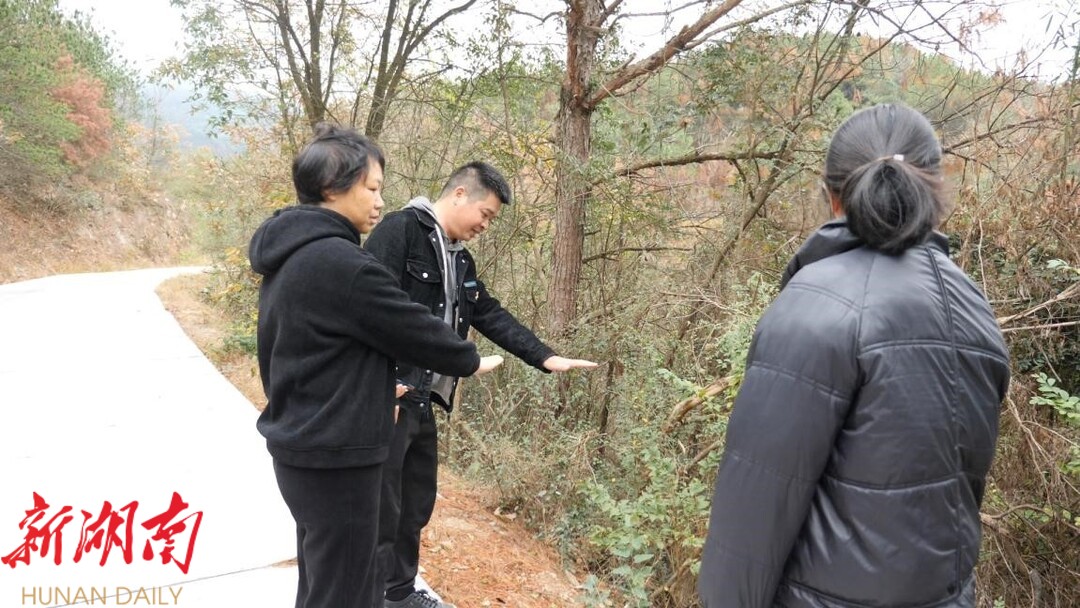 赛头村支村两委现场商讨公路护栏修建设计。