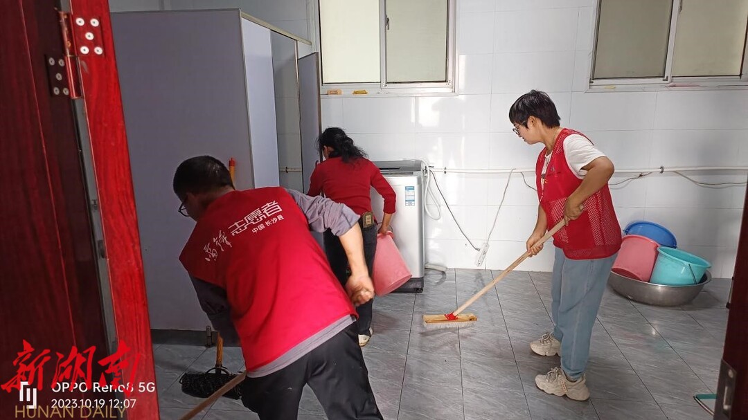 “党建网格群众工作日”党员上门为敬老院清洁浴室。