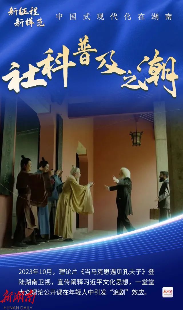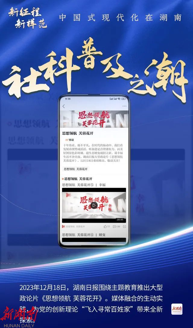 “宁心”发声,凝心聚魂。“宁心”文章是省委宣传部重点打造的评论宣传品牌。 去年6月27日至7月7日、12月4日至15日,《湖南日报》等各大省内主流媒体重要版面、重要位置接连刊发20篇“宁心”文章。这些文章,紧紧围绕主题教育的两个阶段,以“学深悟透习近平新时代中国特色社会主义思想”“把学习贯彻习近平新时代中国特色社会主义思想不断引向深入”为主题展开论述。其独到的选题策划、深刻的思考解读、严谨的论证手法、鲜明的表达风格等,都对推动理论评论宣传提质增效提供了有益启示。 平台建设风生水起。去年1月5日,《湖南日报》理论周刊改版升级,成为湖南主流舆论场宣传阐释党的创新理论的重要平台。“理论·新论、学习、智库、新域”4大板块,约请全国及省内名家、大家深刻阐释习近平新时代中国特色社会主义思想的重大意义、丰富内涵、精神实质和实践要求,延展理论阐释的边界;建立起与全国各地、各高校、各学科一流学者的高效联动,借力发力、形成合力。 “掌握好高质量发展的科学方法论”“做实基点,高质量发展才有底气”……2023年全国两会期间,《湖南日报》前方报道团队密集约访全国顶级专家学者,围绕湖南如何深学笃行习近平新时代中国特色社会主义思想,话思考、出良策。 2023年10月,一档名为《当马克思遇见孔夫子》的理论片登陆湖南卫视。节目通过聚焦“第二个结合”的核心内涵和重大意义,宣传阐释习近平文化思想。《执经叩问》《高山流水》《结合之路》《别开生面》《固本开新》,一堂堂大众理论公开课在年轻人中引发“追剧”效应。 亮点远不止这些。宣传阐释党的二十大精神,推出《思想领航·学习十问》精品思政课、《十讲二十大》系列短视频;围绕主题教育,推出“思想领航 芙蓉花开”政论片;在习近平总书记为湖南擘画“三高四新”美好蓝图三周年前夕,一篇《山河远阔 芙蓉花开——写在锚定“三高四新”美好蓝图,加快推动高质量发展的新征程上》的政论文章,让人读之齿颊留香、回味无穷。媒体融合的生动实践,为党的创新理论“飞入寻常百姓家”带来全新探索。 基层理论宣讲“燃”起来。全省各地挂牌成立市级理论宣讲示范基地200余个,持续擦亮“就认这个理”“衡有道理”“为理而来”等宣讲品牌,“理响永州”理论宣讲节目网络总浏览量超3亿人次。理论宣讲不再“一篇讲稿打天下”,而是积极探索开展“提问式宣讲”。去年新推出的“山乡有理·系列说”“院坝小讲堂”“就认这个理·‘理’道湘江”等20余个互动式宣讲品牌,用身边人身边事,讲好党的创新理论的道理学理哲理。 互联网时代,“舆论阵地”的范畴不断扩大。2023年,“好评中国”网络评论大赛在网上掀起了一场思想火花的激情碰撞。大赛邀请党的二十大代表、科技工作者、青年代表、正能量网络名人和往届大赛作者代表等,以案例讲述、情境分享等形式,共论网络评论高质量发展,引领更多网民感受网络评论力量、参与网络评论创作。越来越多社科理论品牌挺进互联网主战场。“网上学习”重点传播工程,“理来我网”系列网上理论传播行动,党的创新理论网络视频传播基地……理论精品供给,让党的创新理论化作网上强音,画好网上网下同心圆。 2024年是新中国成立75周年,是实现“十四五”规划目标任务的关键一年。 社科理论界抓住宝贵机遇,集中精锐力量,打出几手“好牌”,拿出几道“硬菜”,奋力谱写新时代哲学社会科学繁荣发展的湖南新篇章,定将为加快实现“三高四新”美好蓝图作出新的更大贡献。