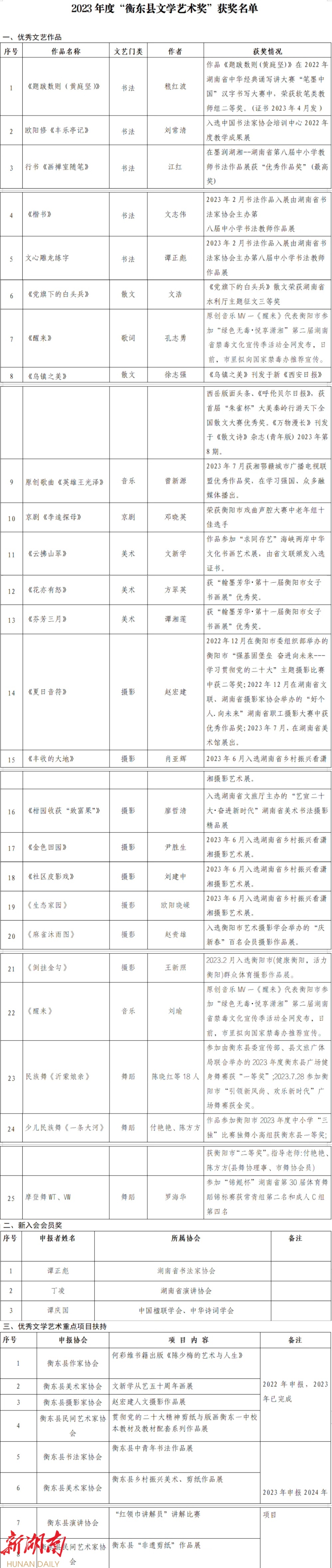 自2023年度“衡东县文学艺术奖”评选工作启动起来,经评审组的公正、公平评审,共评选出25件优秀文艺作品,3个新入会会员奖,4个文艺项目扶持,4个文艺重点项目申报,11名先进文艺工作者,5个先进工作单位。现将获奖名单予以公布。