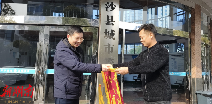 财汇新天地业主代表师振兴将锦旗递给长沙县城管局相关负责人。宋彬彬 摄
