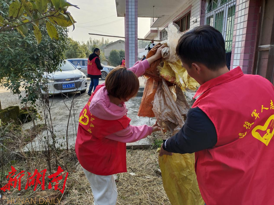 志愿者帮助特殊困难村民打扫卫生。