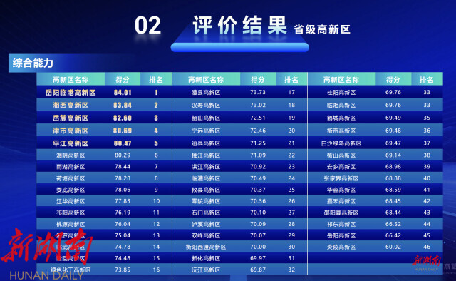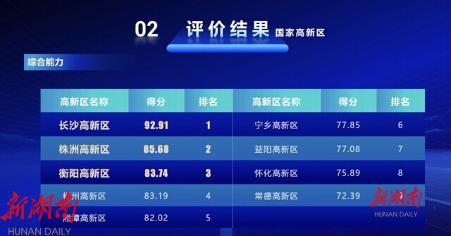 《高新区报告》评价结果显示,长沙高新区、株洲高新区 、衡阳高新区分别居全省9个国家高新区的前三位;岳阳临港高新区、湘西高新区、岳麓高新区、津市高新区和平江高新区位居全省46家省级高新区的前五位。