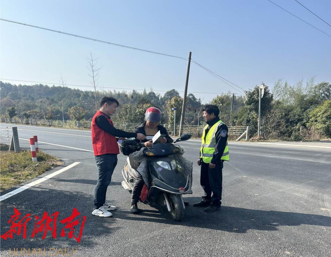 “大叔,开车一定要记得系好安全带,安全问题可不是小事情。”“嗲嗲,你这个头盔扣子都没扣上的,关乎自身安全,可不能敷衍哦!”在路口镇上杉市村黄兴大道十字路口处,志愿者们对不文明的交通行为进行劝导,面对面宣讲典型交通事故案例、发放宣传资料,广泛宣传超员、横穿马路、闯红灯、违规载人、骑行电动车不佩戴头盔等违法行为的危害性及交通安全常识,倡导自觉遵守交通法律法规。
