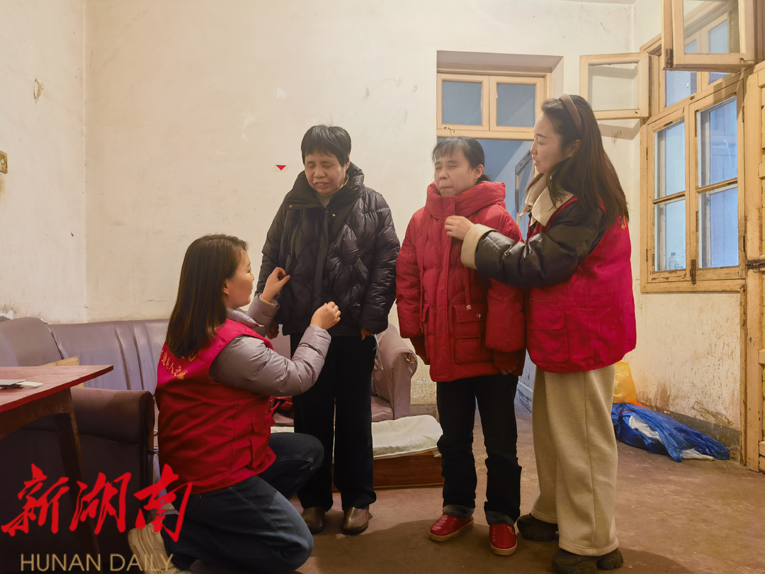 李婷、彭青青为汤建华母女穿上为她们购买的羽绒服。